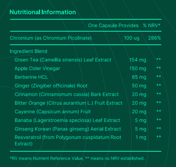 De aanduiding “**” in de tabel betekent dat er voor deze ingrediënten geen NRV is vastgesteld; alleen voor chroom is een referentiewaarde aangegeven. De combinatie verenigt klassieke thee-ingrediënten en kruidenextracten met geselecteerde bittere en bioactieve stoffen. Zo ontstaat een duidelijk aangegeven samenstelling, die inzet op transparante hoeveelheden per capsule en zowel traditionele plantenextracten als een essentieel sporenelement integreert.